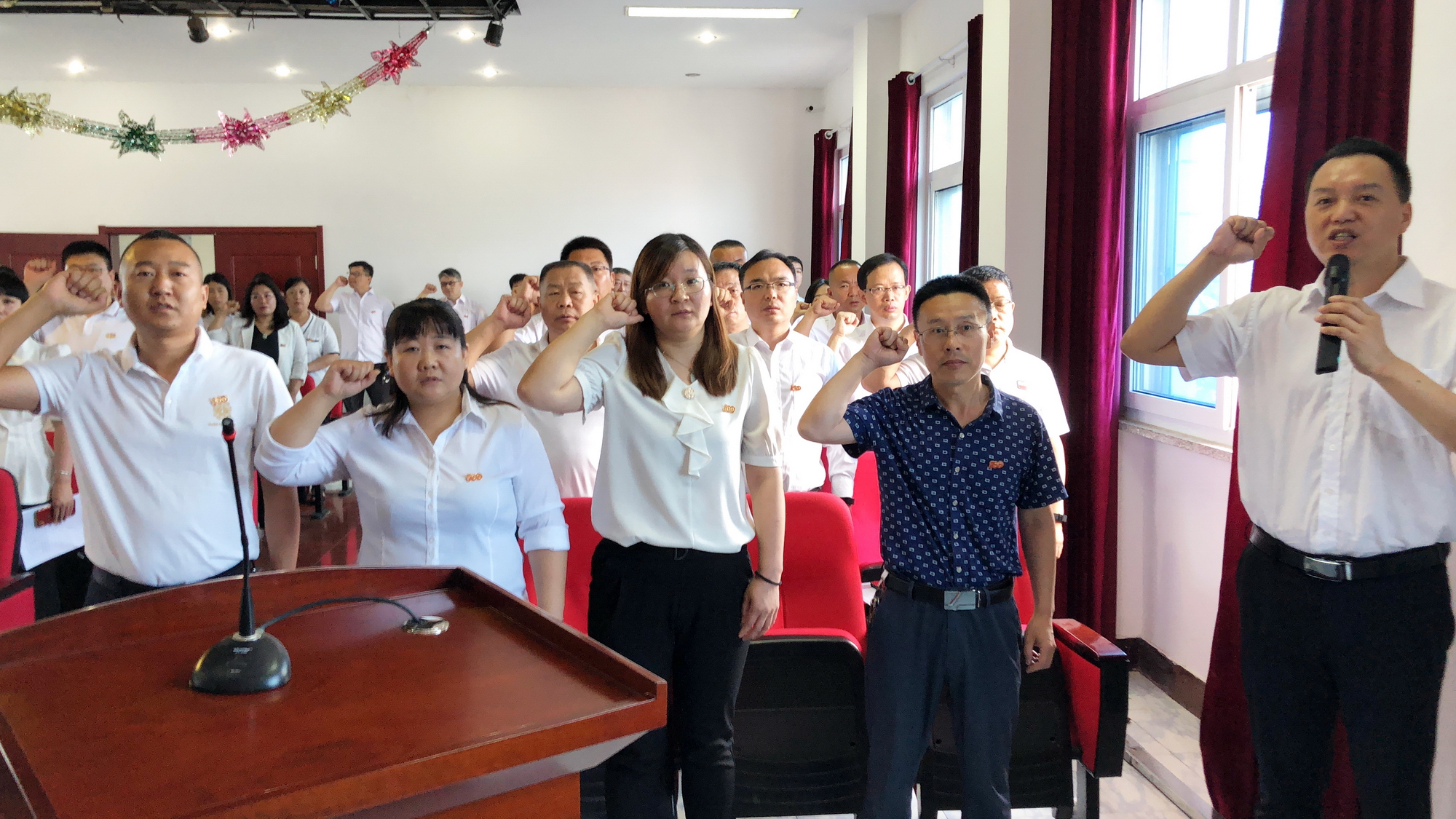 集团党委委员张军辉带领新党员入党宣誓,与会党员一起重温了入党誓词。庄严的宣誓声,响彻耳畔、铭记于心。